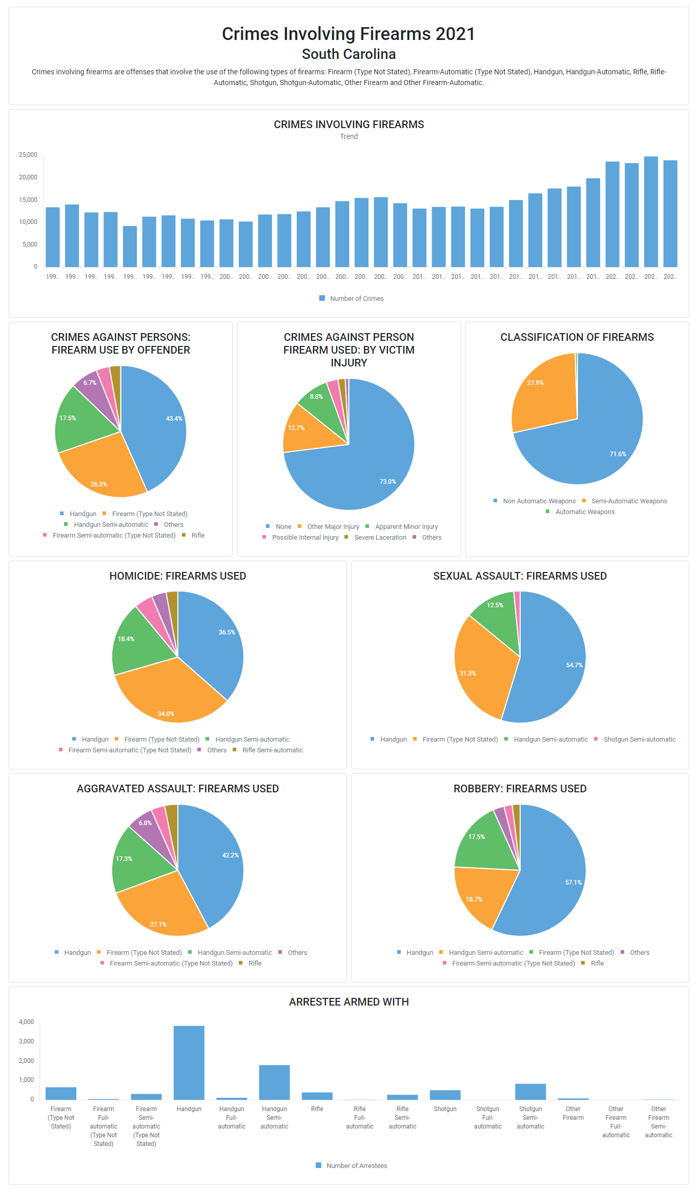 Crimes involving firearms are offenses that involve the use of the following types of firearms: Firearm (Type Not Stated), Firearm-Automatic (Type Not Stated), Handgun, Handgun-Automatic, Rifle, Rifle-Automatic, Shotgun, Shotgun-Automatic, Other Firearm and Other Firearm-Automatic.